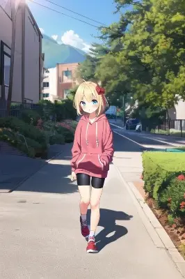 masterpiece, best quality, {{1girl}, {{loli}},blond hair,blue eye,{{{hair bow}}},{{red bow}},short hair, bike shorts,hoodie,outdoors, walking,