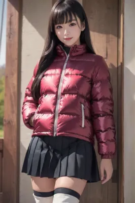 (photorealistic:1.4), (RAW photo), masterpiece, best quality, extremely detailed, lady, elegant, seduce, almond shaped eyes, smile, staring, felt fabric flared skirt, BREAK, (shiny, glossy, short down jacket:1.2), knee-high boots, plateau, spectacular view, cold day, <lora:hime_style-1.0r8:0.8>,
