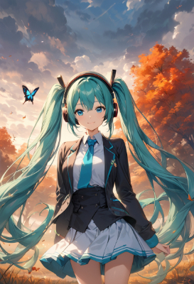 masterpiece, best quality, extremely detailed, anime, girl, skirt,Hatsune Miku, vocaloid, 1girl, twin tails, long hair, blue hair, green hair, blue eyes, necktie, headphones, prairie, cloudy sky, dark fog, fantastic, smile,mini skirt,twintail,longhair,fantasy,butterfly,<lora:AimingAtYouV1:1>, atyou,autumn