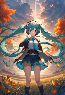 masterpiece, best quality, extremely detailed, anime, girl, skirt,Hatsune Miku, vocaloid, 1girl, twin tails, long hair, blue hair, green hair, blue eyes, necktie, headphones, prairie, cloudy sky, dark fog, fantastic, smile,mini skirt,twintail,longhair,fantasy,butterfly,<lora:AimingAtYouV1:1>, atyou,autumn