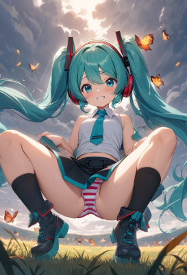 masterpiece, best quality, extremely detailed, anime, girl, skirtmasterpiece, best quality, extremely detailed, anime, girl, skirt,Hatsune Miku, vocaloid, 1girl, twin tails, long hair, blue hair, green hair, blue eyes, necktie, headphones, prairie, cloudy sky, dark fog, fantastic, smile,mini skirt,twintail,longhair,fantasy,butterfly, atyou,autumn Hatsune Miku, vocaloid, 1girl, twin tails, long hair, blue hair, green hair, blue eyes (red and white horizontal striped panties: 1.2), (spread legs: 1.3), 1girl, blush, smile, (hatsune miku: 1.3), silver sleeveless shirt, green tie, black skirt, (on the ), <lora:AimingAtYouV1:1>