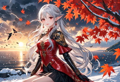 4K,8K,((masterpiece,best quality,Ultra extremely detailed,perfect anatomy,detailed,high resolution,highres,extremely detailed)),((from_above:1.5,flower print,children female elf wearing see-through black shoulder-length dress dress with flill,see-through tight skirt ,see-through sleeves, see-through white Long gloves of nobility,wearing glossy red silk jacket with halation )),looking at viewer, red Eye, Reflections reflect strong highlight in eyes,waving shining long white hair_with curly hair,(big red ribbon),red Eye,elf ear with big earrings,opening mouth,smile,blush,lipstick,full fresh lips,big hip,small breasts,BREAK,4K, many maple leaves,maple,tree,birds,clouds,dark clouds,flushing lightning,snow field,strong wind,near sea,sunrise,walking birds,<lora:hairdetailer:1> <lora:make25d_type1_v100:1>,,,