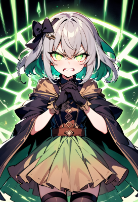 masterpiece, best quality, extremely detailed, high resolution, Japanese anime,1girl, cowboy shot, ((no hat:1.3)), medium breasts, slender,16 -year-old, 154cm tall, original character, fantasy,(blonde hair),(asymmetric bangs:1.3),(short hair:1.3), (1hairpin), (leaf green eye:1.2), (tareme, with eyelashes), (beautiful detailed eyes:1.3), (open mouth), (fang), squinting, BREAK(Element Background:1.3), (a lot of shining),(beautiful fingers:1.3), BREAK (white long gloves:1.3), (green frill dress:1.2), (Hexagon pattern, brown long skirt:1.3), (white stocking:1.3), (make fists), BREAK (shoot from front:1.3)