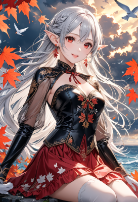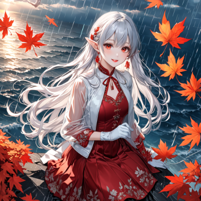 4K,8K,((masterpiece,best quality,Ultra extremely detailed,perfect anatomy,detailed,high resolution,highres,extremely detailed)),((close-up eye,from above,flower print,children female elf wearing see-through black shoulder-length red cloth dress with flill,see-through silk skirt ,see-through sleeves, see-through white Long silk gloves,wearing glossy white leather jacket, reflecton light,sitting)),looking at viewer, red Eye, Reflections reflect strong highlight in eyes,waving shining long white hair_with curly hair,red Eye,elf ear with big earrings,open_mouth,smile,blush,lipstick,full fresh lips,big hip,small breasts,handing KASA,BREAK,4K, rain,KASA(Japanese umbrella),many maple leaves,maple,tree,birds,clouds,dark clouds,flushing lightning,wind,near sea,sunrise,birds,<lora:hairdetailer:1> <lora:make25d_type1_v100:1>,,,