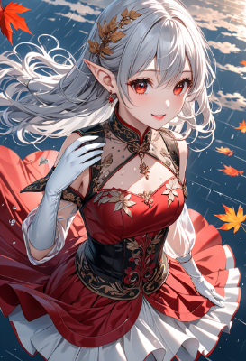 4K,8K,((masterpiece,best quality,Ultra extremely detailed,perfect anatomy,detailed,high resolution,highres,extremely detailed)),((close-up eye,from above,flower print,children female elf wearing see-through black shoulder-length red cloth dress with flill,see-through silk skirt ,see-through sleeves, see-through white Long silk gloves,wearing glossy white leather jacket, reflecton light,sitting)),looking at viewer, red Eye, Reflections reflect strong highlight in eyes,waving shining long white hair_with curly hair,red Eye,elf ear with big earrings,open_mouth,smile,blush,lipstick,full fresh lips,big hip,small breasts,with closing gothic style umbrella,BREAK,4K, rain, many maple leaves,maple,tree,birds,clouds,dark clouds,flushing lightning,wind,near sea,sunrise,birds, ,,,,,