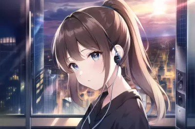 {{beautiful detailed eyes}}, {{perfect composition}}, {{extremely detailed CG unity 8k wallpaper}}, oil painting, leaning to the side, Dynamic angles, {{{{official art}}}}, lens flare, {{{{{{{famous artist}}}}}}}, {{{{little girl}}}}, {{{{solo}}}}, {{ponytail}}, {{{brown hair}}}, put on earphones, laptop,