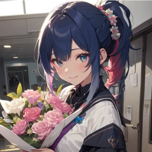 Cowboy Shot,(black hair,pink inner hair:1.2),(light Pink Rose Garden),(Holding a pale pink rose),From the side,
