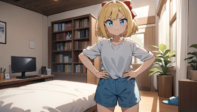 1girl,solo,loli,young girl,blonde hair,short hair,blue eyes,heart-shaped pupils,big red ribbon,(hair bow:1.4),red bow,child,small breasts,short height,delicate features,kawaii,casual wear,white t-shirt,pink pleated skirt,white knee socks,brown leather shoes,heart pattern,doll,plush toy,holding doll,smiling,happy expression,approval,looking at viewer,standing,relaxed pose,arms hugging doll,feet together,toes slightly pointed inward,head tilted,moe,chibi style,anime style,soft shading,pastel colors,indoors,cozy bedroom,pink wallpaper,wooden floor,stuffed animals on shelf,flower pattern curtains,sunlight through window,warm lighting,soft shadows,depth of field,detailed clothing folds,sparkles,cute atmosphere,blush,rosy cheeks,