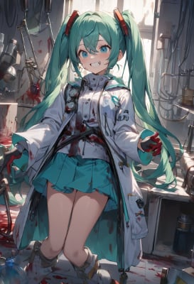 masterpiece, best quality, extremely detailed, anime, girl, ,Illustration of Hatsune Miku, vocaloid, 1girl, twin tails, long hair, blue hair, green hair, blue eyes, Mad Doctor girl. Scientist-like figure wearing a white coat with blood on it and wearing goggles and gloves. Her hair is slightly disheveled, and she has a crazy smile on her face. Strange machines, experimental equipment, and chemicals line up in the background, creating an eerie atmosphere of the laboratory. Blood is scattered on the floor and walls.,twintail,longhair,skirt,mini skirt