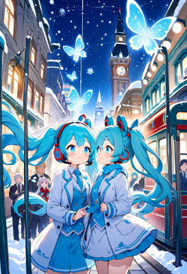 masterpiece, best quality, extremely detailed, anime, girl, skirt,Hatsune Miku, vocaloid, 1girl, twin tails, long hair, blue eyes, snow miku, necktie, headphones, light blue twin tails, clock tower town at night, snowfall, streetcar, snowflakes, starry sky,twintail,longhair,eye contact,fantasy,city,butterfly