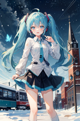 masterpiece, best quality, extremely detailed, anime, girl, skirt,Hatsune Miku, vocaloid, 1girl, twin tails, long hair, blue eyes, snow miku, necktie, headphones, light blue twin tails, clock tower town at night, snowfall, streetcar, snowflakes, starry sky,twintail,longhair,eye contact,fantasy,city,butterfly