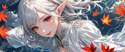 4K,8K,((masterpiece,best quality,Ultra extremely detailed,perfect anatomy,detailed,high resolution,highres,extremely detailed)),eye contact,((close-up eye,from above,flower print,little two elves wearing see-through black shoulder-length red cloth dress with many flill,see-through silk skirt ,see-through sleeves, see-through white Long silk gloves,wearing glossy white leather jacket, reflecton light,flying)),looking at viewer, red Eye, Reflections reflect strong highlight in eyes,waving shining long white hair_with curly hair,red Eye,elf ear with big earrings,open_mouth,smile,blush,lipstick,full fresh lips,big hip,small breasts,eye_contact,BREAK,another elf,BREAK,4K,many maple leaves,maple tree,birds,clouds,dark clouds,flushing lightning,wind,cloud sea,sunrise,birds, ,