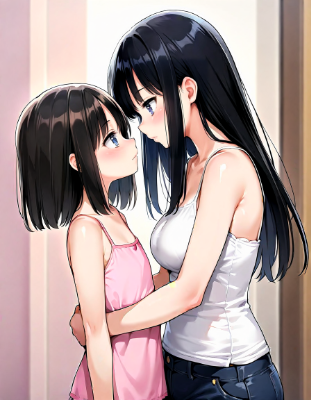 2girls, standing, demon girl, crossed arms, black hair, long hair, red eyes, devil horns, devil wings, evil grin, devil tail, small breasts, ADDCOL