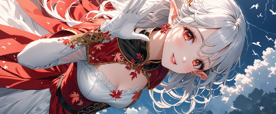4K,8K,((masterpiece,best quality,Ultra extremely detailed,perfect anatomy,detailed,high resolution,highres,extremely detailed)),eye contact,((close-up eye,from above,flower print,little two elves wearing see-through black shoulder-length white leather dress with many flill,see-through silk skirt ,see-through sleeves, see-through white Long silk gloves,wearing glossy silver leather jacket, reflecton light,flying)),looking at viewer, red Eye, Reflections reflect strong highlight in eyes,waving shining long white hair_with curly hair,red Eye,elf ear with big earrings,open_mouth,smile,blush,lipstick,full fresh lips,big hip,small breasts,eye_contact,BREAK,4K,large halation,many maple leaves,maple tree,birds,clouds,dark clouds,flushing lightning,wind,cloud sea,sunrise,birds,<lora:hairdetailer:1> <lora:make25d_type1_v100:1>,