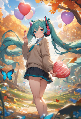 masterpiece, best quality, extremely detailed, anime, girl,twintail,longhair,skirt,mini skirt,blue hair,green hair,blue eyes,luster,masterpiece, best quality, extremely detailed, anime, girl, skirt,mini skirt,twintail,longhair,blue hair,red hair,blue eyes,Stinking eyes,Hatsune Miku, vocaloid, 1 girl, twin tails, long hair, blue hair, green hair, blue eyes, necktie, headphones, smiling Hatsune Miku lies down in a field of flowers in the woods where sunlight shines through the trees. Blue butterflies are flying. A rainbow hangs over the clear blue sky. soap bubbles,fantasy,butterfly,autumn,soapbubbles,masterpiece, best quality, extremely detailed, anime, girl, skirtHatsune Miku, vocaloid, 1 girl, twin tails, long hair, blue hair, green hair, blue eyes, smiling Hatsune Miku standing under a big apple tree on a small hill in the prairie. I'm holding a red heart shaped balloon in my hand,mini skirt,twintail,longhair,sweater,fantasy,autumn