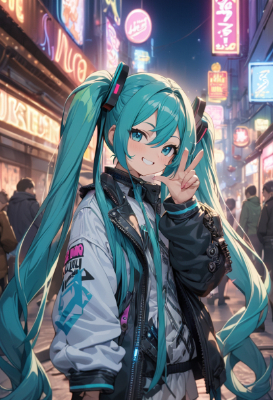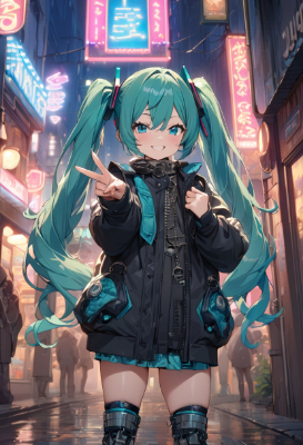 masterpiece, best quality, extremely detailed, anime, girl, ,masterpiece, best quality, extremely detailed, anime, girl, ,twintail,longhair,blue hair,green hair,blue eyes,jacket,Hatsune Miku, vocaloid, 1girl, twin tails, long hair, blue hair, green hair, blue eyes, 1girl, v-sign, night town with neon lights. Hatsune Miku in heavy meta fashion. cute smile, punk, heavy metal,city,luster,steampunk