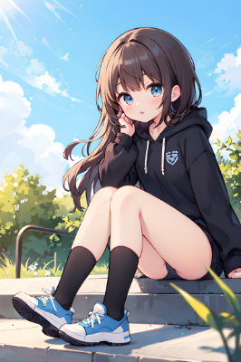 Beautiful, top quality, high quality, beautiful, super detailed depiction,High school girl, light blue eye color, long wavy hair, brown hair,White long hoodie that fits the body, long hoodie that clearly shows the lines of the body, (black knee socks), light blue sneakers, front, facing forward, looking at camera, front, forward hands, station building, nice smile, cute smile, (( perfect fingers)), shopping street, sunset