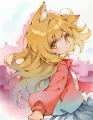 1girl, [satono diamond \(umamusume\)::1],[arknights:blue archive:10],masterpiece, best quality,[watercolor (medium)::10],[painting (medium):1], [traditional media::20],[acrylic:21],upper body, preteen female,dainty body type,[blonde hair:1:10],pleated skirt,[neck ribbon:1],[action,unusual angle:1:5],[(pencil sketch,unfinished:1.2):0.8],[outdoors,urban landscape,gradient sky,ruins:1],BREAK,fox ears,[Medium hair,aged down,[unusual angle::3], light smile,