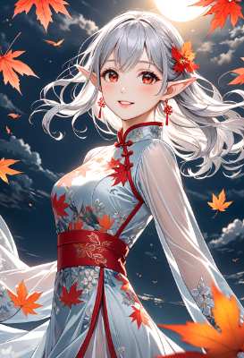 4K,8K,((masterpiece,best quality,Ultra extremely detailed,perfect anatomy,detailed,high resolution,highres,extremely detailed)),eye contact,((close-up hip,from side,flower print,little elf wearing see-through cheongsam clothes with many flill,see-through silk skirt ,see-through sleeves, see-through white Long silk gloves,reflecton light,flying)),looking at viewer, red Eye, Reflections reflect strong highlight in eyes,waving shining long white hair_with curly hair,red Eye,elf ear with big earrings,open_mouth,smile,blush,lipstick,full fresh lips,big hip,small breasts,eye_contact,BREAK,4K,many maple leaves,sea,dark clouds sunrise,birds,many light_ray <lora:hairdetailer:1> <lora:make25d_type1_v100:1>,,