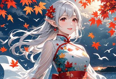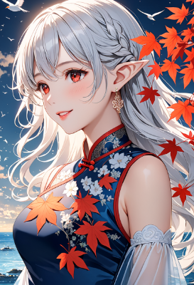 4K,8K,((masterpiece,best quality,Ultra extremely detailed,perfect anatomy,detailed,high resolution,highres,extremely detailed)),eye contact,((upper-body,from side,flower print,little elf wearing glossy deep-blue cheongsam clothes with many flill,see-through sleeves, see-through white Long silk gloves,reflecton light,flying)),looking at viewer, red Eye, Reflections reflect strong highlight in eyes,waving shining long white hair_with curly hair,red Eye,elf ear with big earrings,open_mouth,smile,blush,lipstick,full fresh lips,big hip,small breasts,eye_contact,BREAK,4K,many maple leaves,sea,dark clouds sunrise,birds,many light_ray <lora:hairdetailer:1> <lora:make25d_type1_v100:1>,,