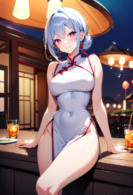 1Wifemodel,colorful, beautiful woman, White chenongsam clothes, masterpiece, extremely fine and beautiful design, extremely fine and beautiful colors, amazing, errings ,twilight time, , ,silver hair,pink eyes,cheongsam clothes,restaurant,masterpiece, extremely detailed, smiling, funny <lora:make25d_type4_v100:1> <lora:saturation:1>