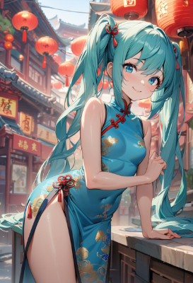 masterpiece, best quality, extremely detailed, anime, girl, ,blue hair,green hair,blue eyes,cheongsam clothes,skirt,twintail,longhair,Hatsune Miku, vocaloid, 1girl, twin tails, long hair, blue hair, green hair, blue eyes, gorgeous Chinatown, Chinese lantern,1girl, bob cut, blue hair, blue eyes, China dress, cute smile,colorful,butterfly