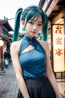 masterpiece, best quality, extremely detailed, anime, girl, ,blue hair,green hair,blue eyes,cheongsam clothes,skirt,twintail,longhair,Hatsune Miku, vocaloid, 1girl, twin tails, long hair, blue hair, green hair, blue eyes, gorgeous Chinatown, Chinese lantern,1girl, bob cut, blue hair, blue eyes, China dress, cute smile,colorful,butterfly,autumn