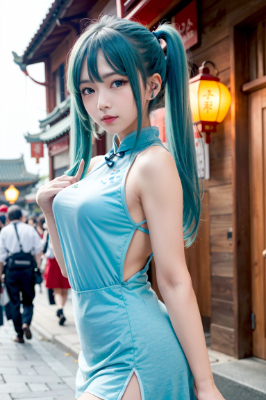 masterpiece, best quality, extremely detailed, anime, girl, ,blue hair,green hair,blue eyes,cheongsam clothes,skirt,twintail,longhair,Hatsune Miku, vocaloid, 1girl, twin tails, long hair, blue hair, green hair, blue eyes, gorgeous Chinatown, Chinese lantern,1girl, bob cut, blue hair, blue eyes, China dress, cute smile,colorful,butterfly,autumn