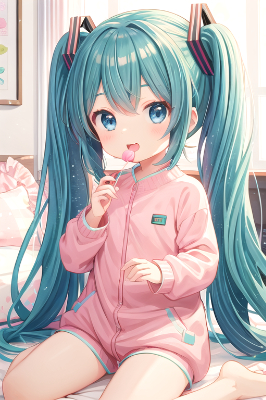 Hatsune Miku, vocaloid, 1girl, twin tails, long hair, blue hair, green hair, blue eyes, Hatsune Miku sits on a chair in front of a computer in a dim room full of machines and drinks an energy drink. Sweets are scattered on the desk.