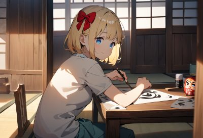 1girl,solo,(short hair:1.2),(blonde hair:1.1),(blue eyes:1.1),(red bow:1.2),(hair bow:1.3),red bow,side bun,(covering one eye:1.3),looking down,pensive expression,subtle smile,cute,soft focus,delicate features,(masterpiece:1.3),(best quality:1.3),(very aesthetic:1.2),(absurdres:1.2),