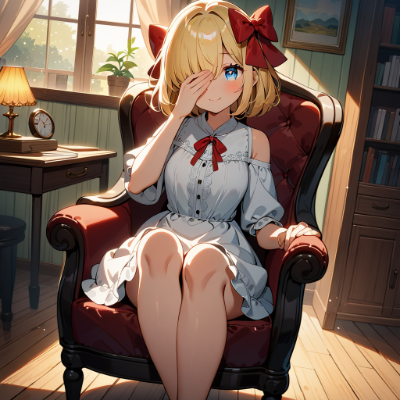 1girl,solo,young girl,blonde hair,short hair,(hair bow:1.4),red bow,blue eyes,(round eyes:1.2),gentle smile,medium breasts,sitting on floor,both hands up,holding brush,painting,daruma doll,one eye painted,concentrated expression,traditional japanese room,tatami floor,wooden sliding door,paper sliding door,warm lighting,afternoon sunlight,sun rays through window,(cozy atmosphere:1.2),indoor,japanese objects,calligraphy scrolls on wall,low table,paint supplies,ink stone,casual pose,leaning forward,back slightly curved,focused gaze,school uniform,neat appearance,soft shadows,gentle color palette,anime style,(masterpiece:1.3),(best quality:1.3),very aesthetic,(absurdres:1.2),