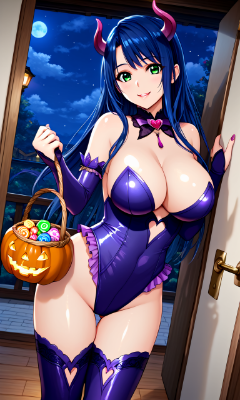 ultra detailed, masterpiece, best quality, aesthetic, perfect lighting, beautiful face, beautiful eyes, cute eyes, shiny hair, 1girl, voluptuous body, large breasts, AilishDG, light blue hair, ponytail, purple eyes, <lora:Aiilish PonyXL V1:0.8>, earing, jewelry, golden breastplate, gold chest protector, armor, detached sleeves, gloves, gauntlets, white pelvic curtain, purple thigh highs, little smile, pumpkin spell, pumpkin spell, <lora:PumkinSpellPony:0.7>, holding pumpkin, (blue glowing pumpkins:1.3), floating pumpkins, forest, night