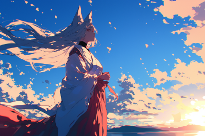 anime, flat colors, crayon drawing, cinematic lighting, magic hour, vast sky, falling, floating feet, in the sky, killer queen, beautiful cool dark-skinned girl, white japanese miko clothes, silk texture, black neck undershirt, white hair, fox ears, thick eyebrows, magnificent scene, blur, blur, blur,