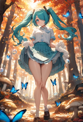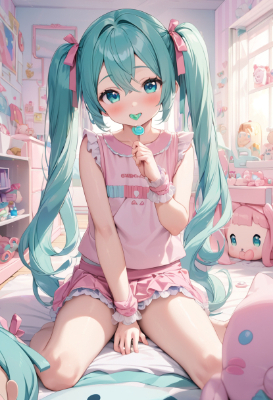 masterpiece, best quality, extremely detailed, anime, , skirt,Hatsune Miku, vocaloid, 1, twin tails, long hair, blue hair, green hair, blue eyes, Hatsune Miku with a cute smile sitting on the bed and licking candy. cute pink costume, children's room, my child, pastel colors,mini skirt,twintail,longhair,girl,Hidden in one eye,boss-eyed