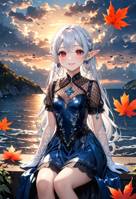 4K,8K,((masterpiece,best quality,Ultra extremely detailed,perfect anatomy,detailed,high resolution,highres,extremely detailed)),((upper-body,flower print,little child elf wearing glossy leather deep-blue gothic-leather-dress with sparkle,see-through sleeves, see-through white Long silk gloves,reflecton light,sitting,((eye-patch)),looking at viewer, red Eye, Reflections reflect strong highlight in eyes,waving shining long white hair_with curly hair hiding her one eye,red Eye,one-eye-closed,elf ear with big earrings,open_mouth,smile,blush,lipstick,full fresh lips,big hip,small breasts,wet,drip,BREAK,4K,many maple leaves,sea,dark clouds sunrise,birds,<lora:hairdetailer:1> <lora:make25d_type1_v100:1>,