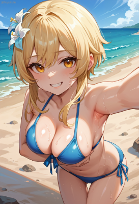 score_9, score_8_up, score_7_up,source_anime, 1girl, (lumine_\(genshin_impact\):0.8), medium_breasts, looking_at_viewer, arm_behind_head,hand_on_own_hip, twisted_torso, BREAK, dark (blue:1.4) shirt, turtleneck, sleeveless_shirt,crop_top, white_pants, tight_clothes, navel, BREAK, cowboy_shot, white_background, dutch_angle, light_smile,