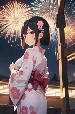 sakura pink yukata, cinematic light, best illumination, outdoor, night, firework, from below,back shot