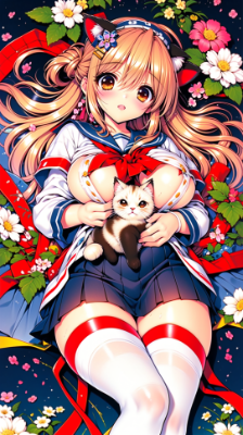 masterpiece, best quality, very aesthetic, highres, ultra-detailed, (detailed clothing:1.3), (detailed body:1.2), (((half updo))), An anime-style girl wearing a sailor school uniform with a red ribbon, lying on a cozy floor surrounded by playful cats. She has brown braided hair, decorated with a hairpin and a small flower, and wears a cute cat-ear headband. The cats around her have ribbons around their necks and look relaxed and playful. The scene includes a traditional Japanese aesthetic with floral patterns and soft colors, giving a warm, relaxing atmosphere. Cherry blossom petals are scattered across the scene, adding a delicate and serene touch. Highly detailed and colorful artwork focused on a calm, cozy setting with a cute character and cats, Meticulous Eyelash Details, an extremely cute and beautiful girl, very Cute face, ((((big tits)))), big ass, white thighhighs, breasts apart, breast curtains, sideboob, underboob, nice hands, perfect hands, more prism, vibrant color,(perfect eyes:0.8), (detailed eyes:1),intricate colors, vibrant colors, color detail,The girl I like the most