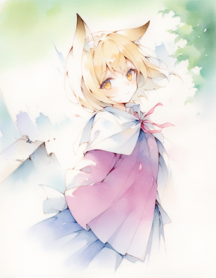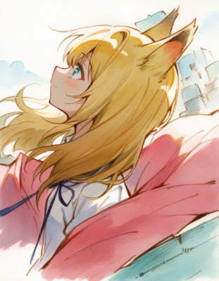 1girl, [satono diamond \(umamusume\)::1],[arknights:blue archive:15],masterpiece, best quality,[(watercolor (medium):0.9)::10],[(painting (medium):1.1):11], [traditional media::20],[acrylic:21],upper body, preteen female,dainty body type,[blonde hair:1:10],pleated skirt,[neck ribbon:1],[action,unusual angle::3],[(pencil sketch,unfinished:1.2):0.8],[outdoors,urban landscape,gradient sky,ruins:1],BREAK,fox ears,[Medium hair,aged down,[unusual angle::3], light smile
