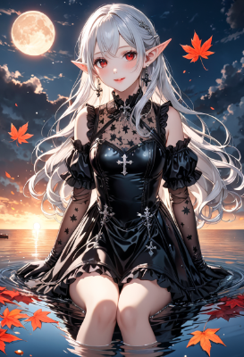 4K,8K,((masterpiece,best quality,Ultra extremely detailed,perfect anatomy,detailed,high-resolution,highres,extremely detailed)),((close-up eye,Stars print,little child elf wearing glossy jewelry decoration deep-black gothic-lolita-enamel-leather-dress with sparkle reflected light,see-through sleeves, see-through white Long silk gloves,reflecton light,crosses her legs.)),looking at viewer, red Eye, Reflections reflect strong highlight in eyes,waving shining long white hair_with curly half-up,red Eye,elf ear with big earrings,open_mouth:1.5,smile,blush,lipstick,full fresh lips,wet lip,big hip,small breasts,drip,BREAK,4K,many maple leaves,sea,dark clouds sunrise,birds,<lora:hairdetailer:1> <lora:make25d_type1_v100:1>,