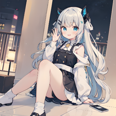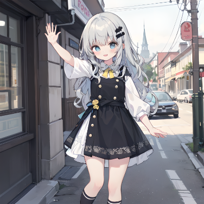 Beautiful, top quality, high quality, beautiful, super detailed depiction, Hair style long wavy half-up brown, eye color light blue, very cute smile, 2 hairpins yellow, front button mini dress waist position light blue, crew socks white, low heel pumps black, daytime, around town, standing, with one hand raised and waving