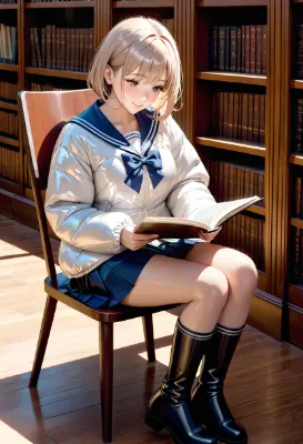 (photorealistic:1.4), (RAW photo), masterpiece, best quality, extremely detailed, lady, neat and clean, quiet, almond shaped eyes, shy look, staring, smile, (shiny, glossy:1.2), navy down jacket, (sailor collar:1.3), pleated skirt, (sock boots:1.3), red ribbon bow tie, reading, library, by the window