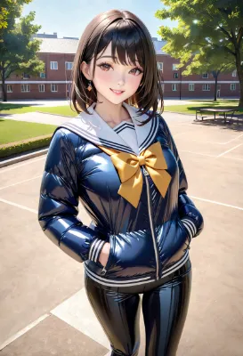 (photorealistic:1.4), (RAW photo), masterpiece, best quality, extremely detailed, lady, neat and clean, elegant, active, almond shaped eyes, smile, shiny, glossy, closed zipper, shiny down jacket, (sailor collar:1.2), (pleated micro mini skirt:1.2), (leather pants:1.2), (long boots:1.3), ribbon bow tie, park, schoolyard, school building