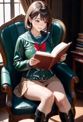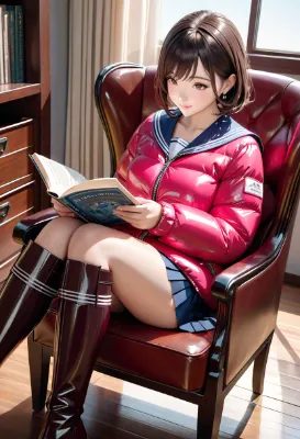 (photorealistic:1.4), (RAW photo), masterpiece, best quality, extremely detailed, lady, neat and clean, elegant, active, almond shaped eyes, smile, shiny, glossy, closed zipper, hot pink, shiny down jacket, (sailor collar:1.2), (pleated micro mini skirt:1.2), (leather pants:1.2), (long boots:1.3), ribbon bow tie, park, schoolyard, school building