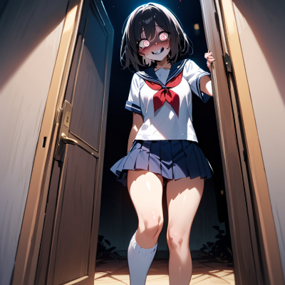 masterpiece,best quality,extremely detailed,1girl,child,infant body type,flat chest,blonde hair,wavy hair,long hair,thick eyebrows,show_forehead,sailor_shirt,long_sleeves,cute_skirt,cute_socks,no_shoes,sitting_on_chair,closed eyes,laughing,She's reading a gag comic book,girl's cute room,