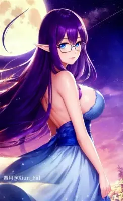 ((best quality)), (ultra-detailed), ((extremely detailed)), 4K, (8K), best quality, (beautiful), anime style, back (of body), moon, Starry sky, star trail, a pretty woman, solo, elf, glasses, dress, beautiful purple hair, beautiful blue eyes, ((beautiful eyes)), long hair, large breast, slim, slender, flowers, light smile, blush, shiny
