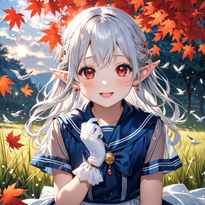 8K,((masterpiece,best quality,Ultra extremely detailed,perfect anatomy,detailed,high-resolution,highres,extremely detailed)),((close-up eye,Flowers print,little child elf wearing glossy jewelry decoration deep-black sailor suit with sparkle reflected light,see-through sleeves, see-through white Long silk gloves,Camisole with ruffles,reflecton light,crosses her legs.)),looking at viewer, red Eye, Reflections reflect strong highlight in eyes,waving shining long white hair_with curly half-up,red Eye,elf ear with big earrings,open_mouth:1.5,smile,blush,lipstick,full fresh lips,wet lip,big hip,small breasts,BREAK,4K,plaza in grasses,many maple leaves,maple tree,dark clouds sunrise,birds, ,,