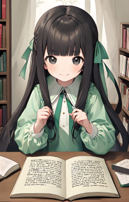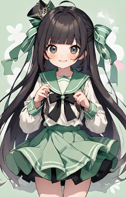 1 girl,(((very longest hair))),black hair, ,straight Hair,hair ribbon,mintgreen stripe,Black Eyes,flat chest,straight Across bangs,princess Cut, Very Long Sideburn,roundry Head,Droping eyes,cute,Meekness,Bob Cut,long back hair,12 years Old, smile,kimono,maple,fall foliage