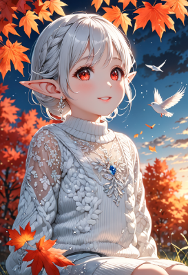 8K,((masterpiece,best quality,Ultra extremely detailed,perfect anatomy,detailed,high-resolution,highres,extremely detailed)),((close-up eye,Flowers print,little child elf wearing glossy jewelry decoration parl-white woollen-sweater-suit with sparkle reflected light,see-through sleeves, see-through white woolen-gloves,reflecton light,crosses her legs)),looking at viewer, red Eye, Reflections reflect strong highlight in eyes,waving shining long white hair_with curly,red Eye,elf ear with big earrings,open_mouth:1.5,smile,blush,lipstick,full fresh lips,wet lip,big hip,small breasts,BREAK,4K,plaza in grasses,many maple leaves,maple tree,dark clouds sunrise,birds,<lora:hairdetailer:1> <lora:make25d_type1_v100:1>,