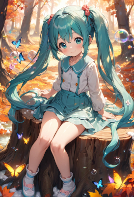 masterpiece, best quality, extremely detailed, anime, girl, skirt, Hatsune Miku, blue-green twintails, sitting on a tree stump in a sunlit autumn forest with a cute smile, flowers blooming and butterflies flying, fantasy, soap bubbles, rainbow, child, our child